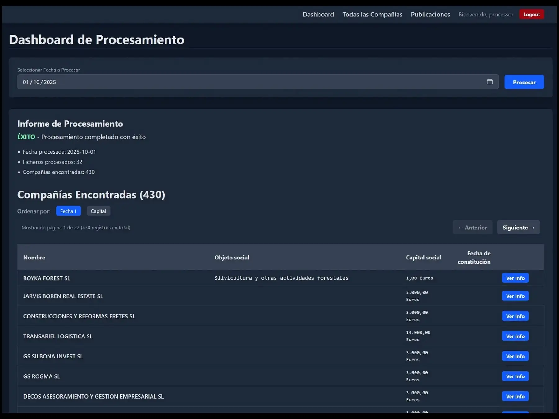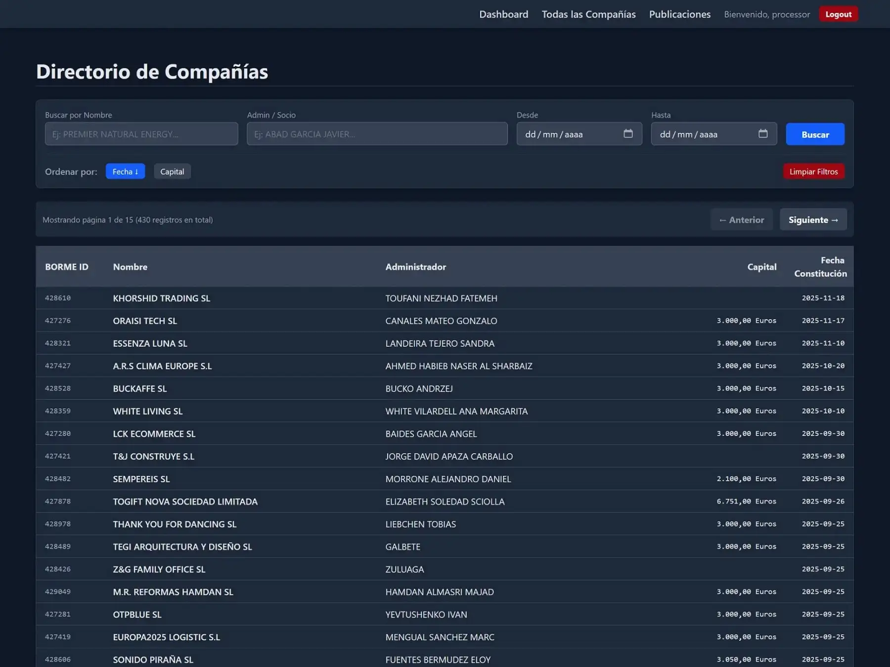 Más allá del código, el reto fue decidir qué datos eran útiles. Implicó analizar el "ruido" (por ejemplo si "objeto social"(categoría de empresa) era útil a pesar de estar a menudo vacío) y priorizar el valor al usuario, para que las funciones de búsqueda y ordenación fueran realmente útiles.